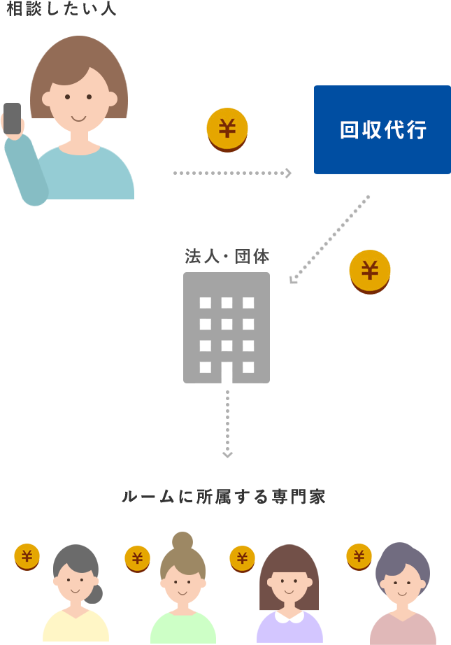 相談後の料金はシステムにより回収代行。月締めにて利用料をお支払いします。(法人・団体より専門家へ報酬を分配)